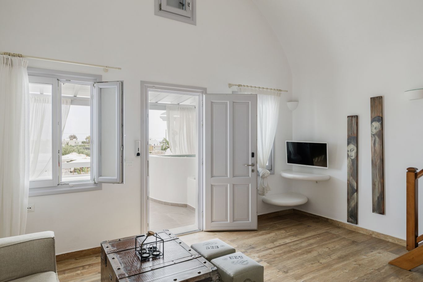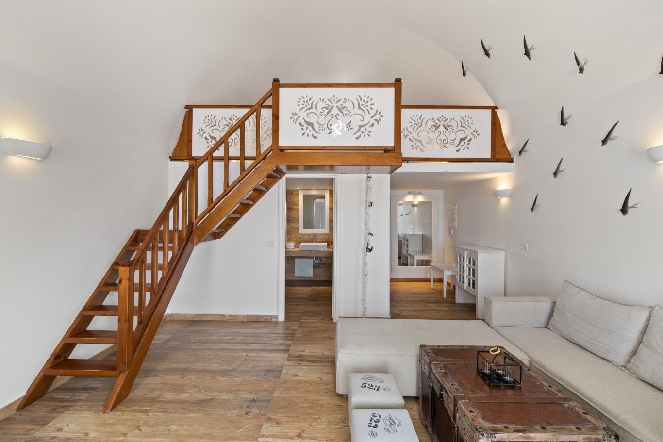 Ascend the elegant wooden staircase to your serene master bedroom, set on the upper level for added privacy and charm. Below, the spacious living area invites you to unwind, while outside, your private veranda with Jacuzzi overlooks the hotel’s main pool—perfect for moments of deep relaxation under the Santorini sun.