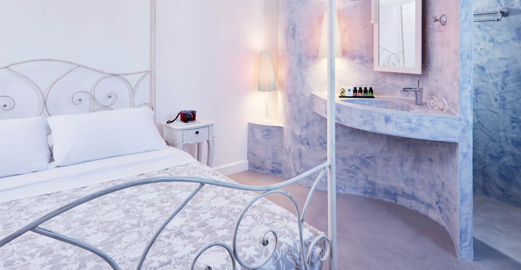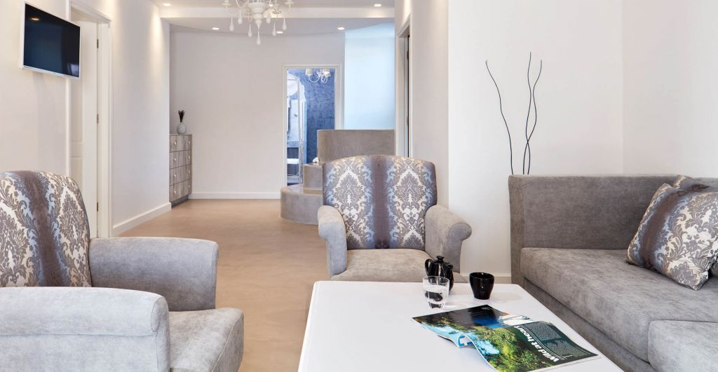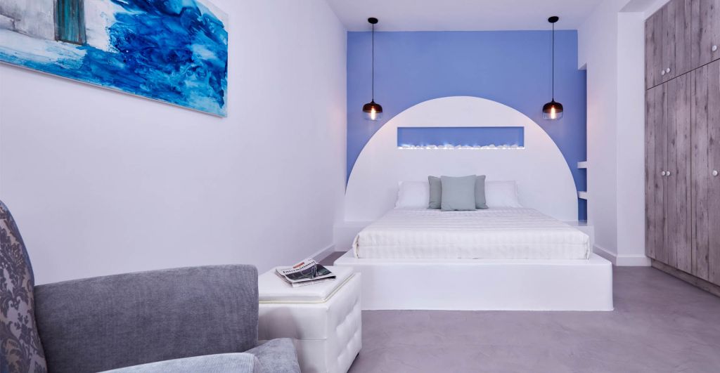 The epitome of luxury, seclusion and functionality at Orabel’s largest suite of 80 sq.m. White purity ties perfectly with all the shades of the Aegean’s blue at the walls and decorative elements of the Master Suite, which offers two king size beds, a fully equipped kitchenette and a spacious living room area.