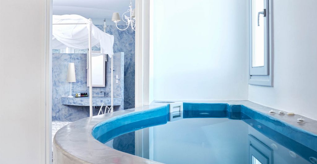 “An oasis of luxury and privacy, with an indoor Jacuzzi-pool and unique views to the blue of Santorini.”